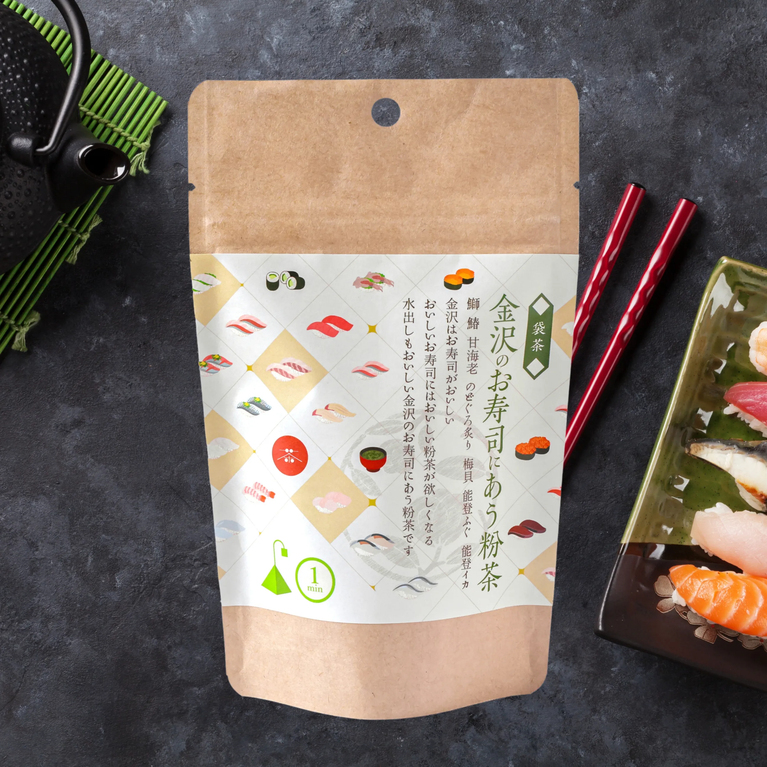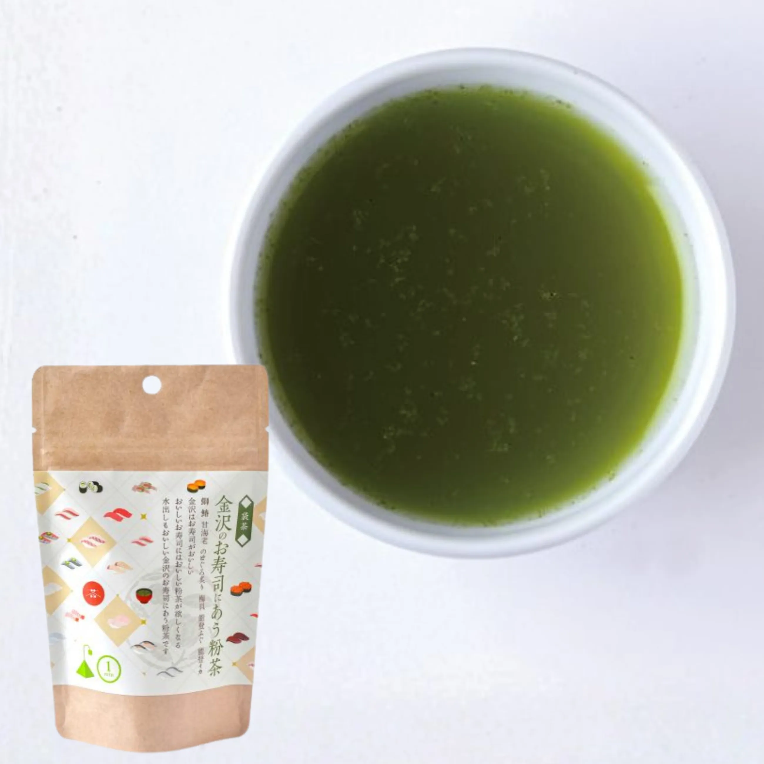 「金沢のお寿司にあう粉茶」は、金沢の食文化を代表する“お寿司”との相性を考えて仕上げた、 茶のみ仲間の粉茶です。