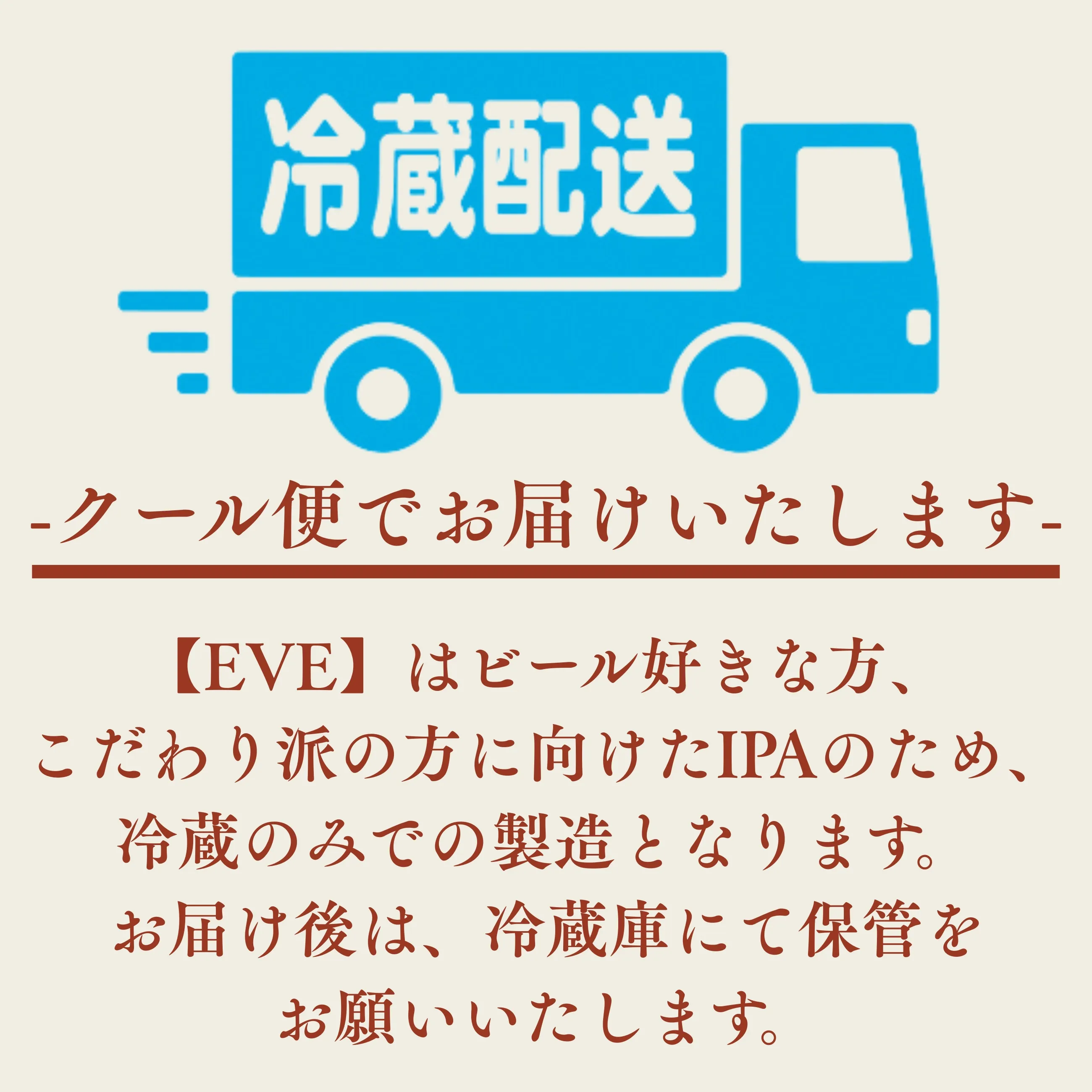 こちらの商品【EVE】は、ビール好きな方やグルメな方、こだわり派の方に向けたIPAのため、あえて冷蔵のみの生ビールで製造しております。プレミアムなテイストを保つ為、購入後は冷蔵で保管してください。