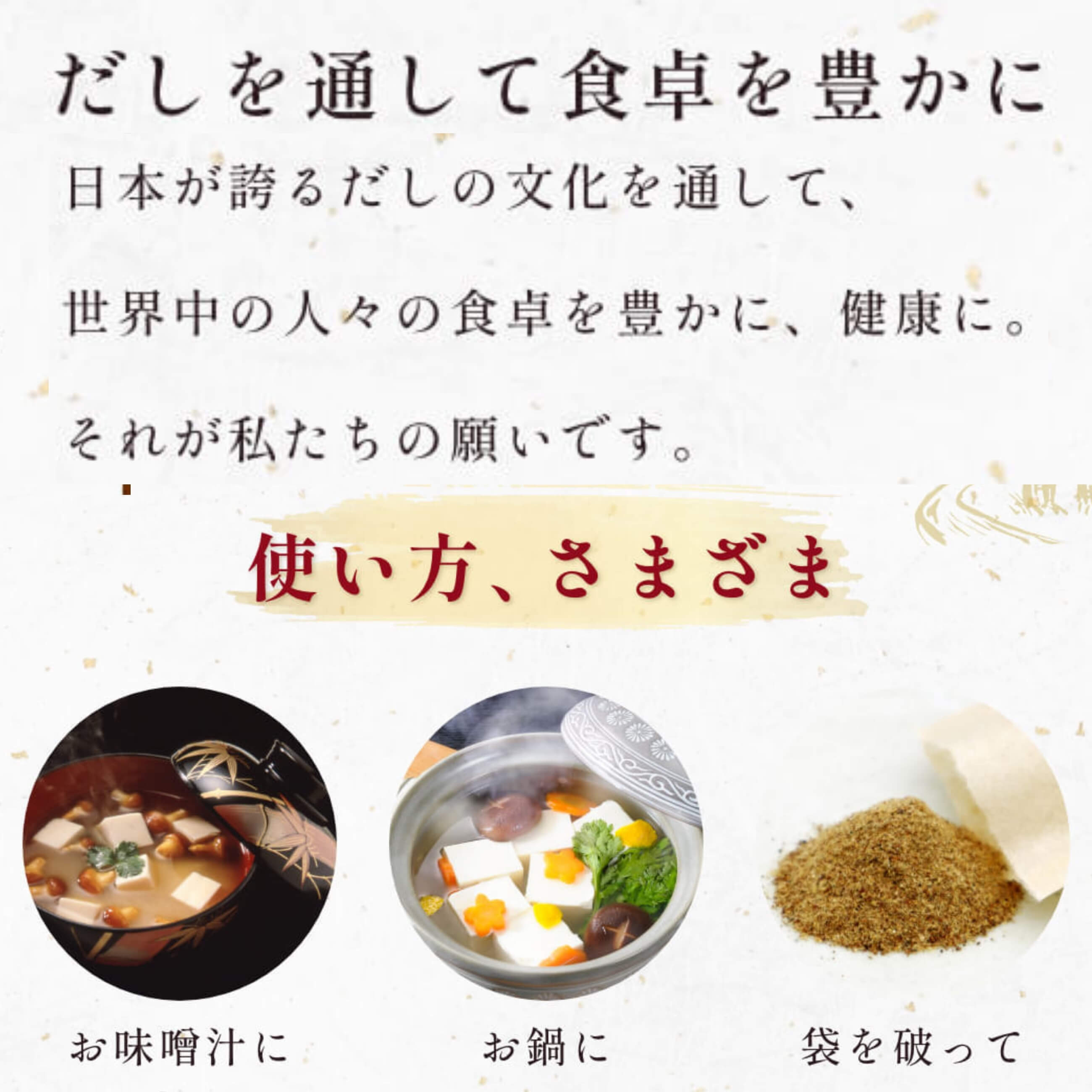 みそ汁、鍋物、おでん等の料理にご利用ください。天然素材の味わいをお楽しみください。