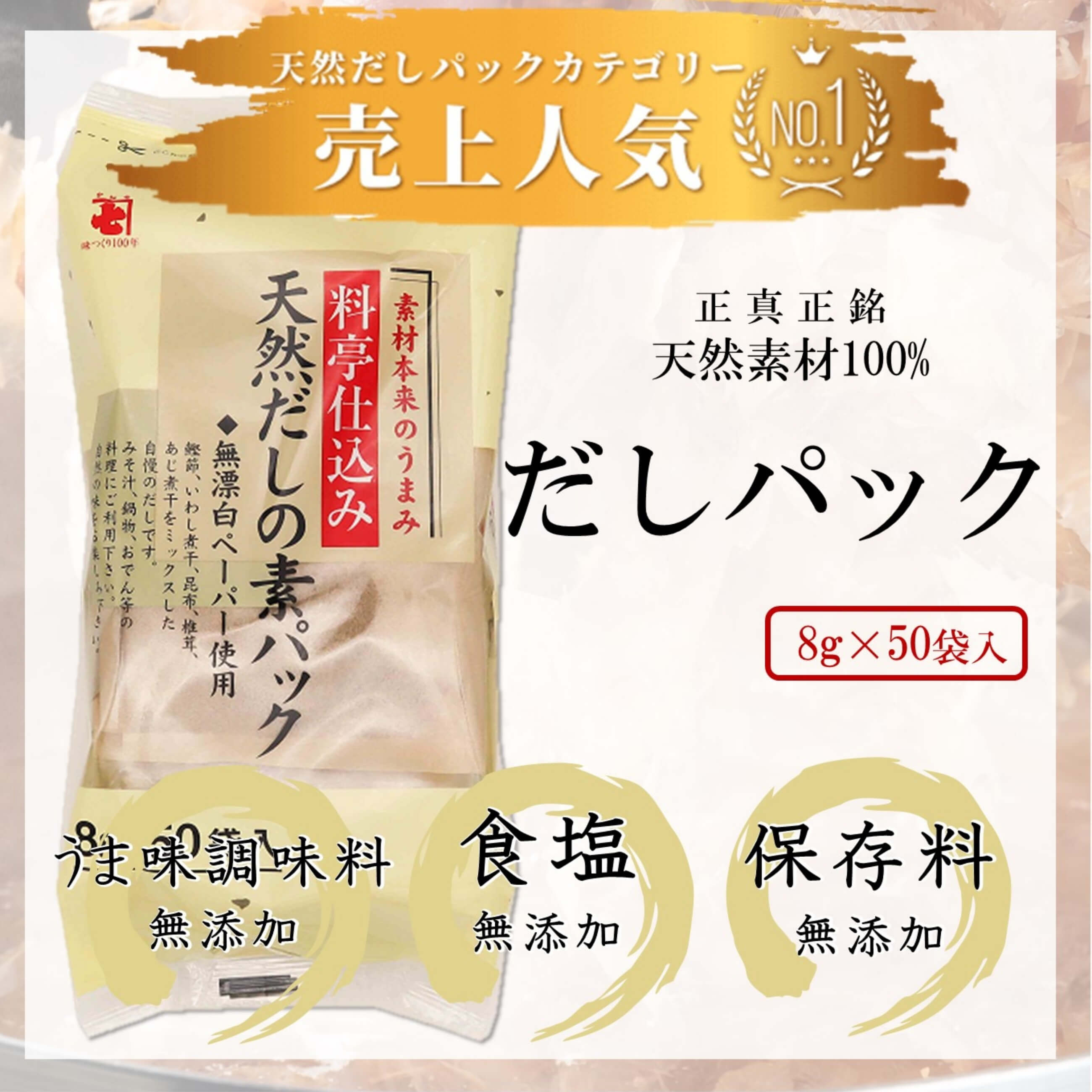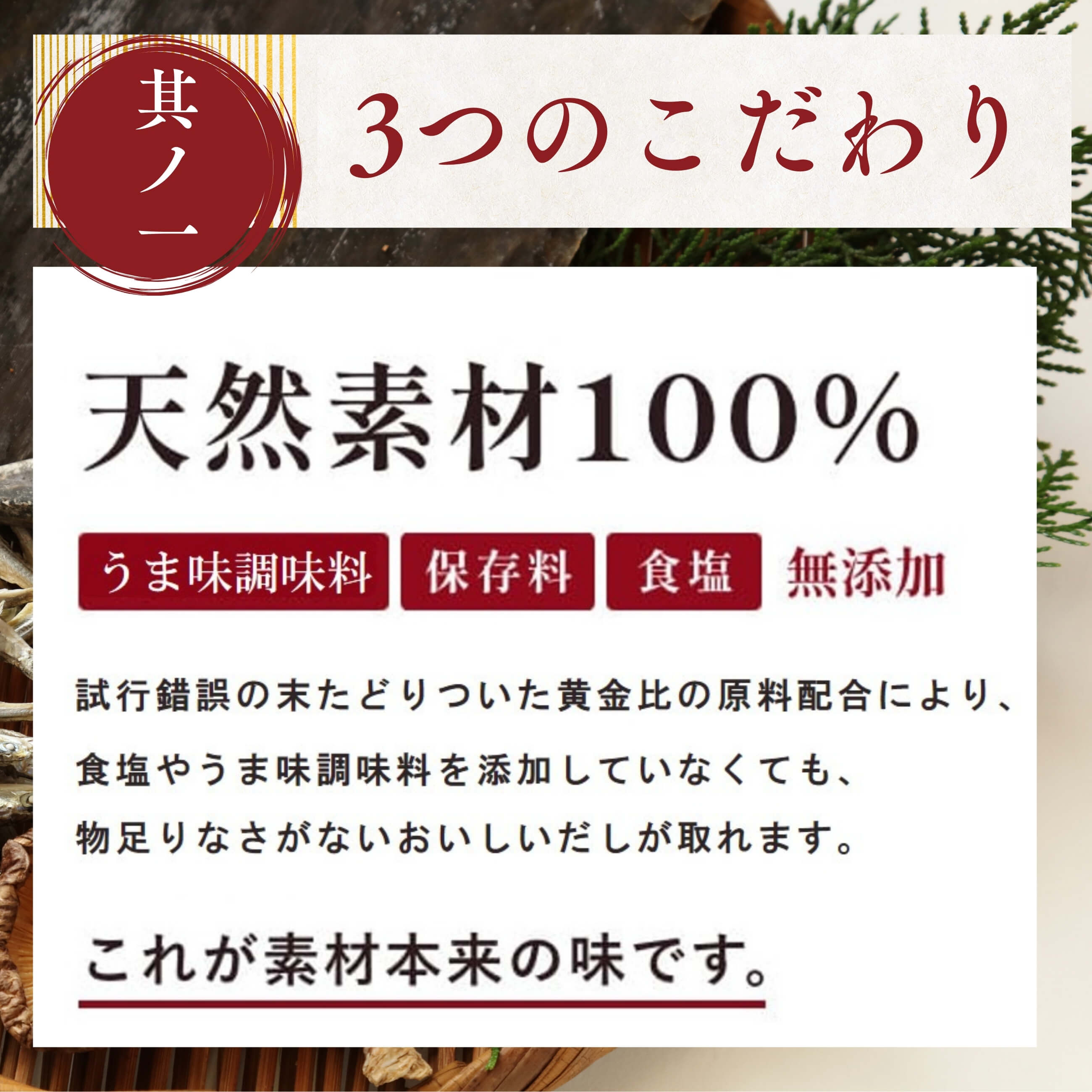鰹節、いわし煮干、昆布、椎茸、あじ煮干をバランスよく配合した自慢のだしパックです。安心・安全にとことんこだわった、うま味調味料・保存料・食塩全て無添加の天然だしです。