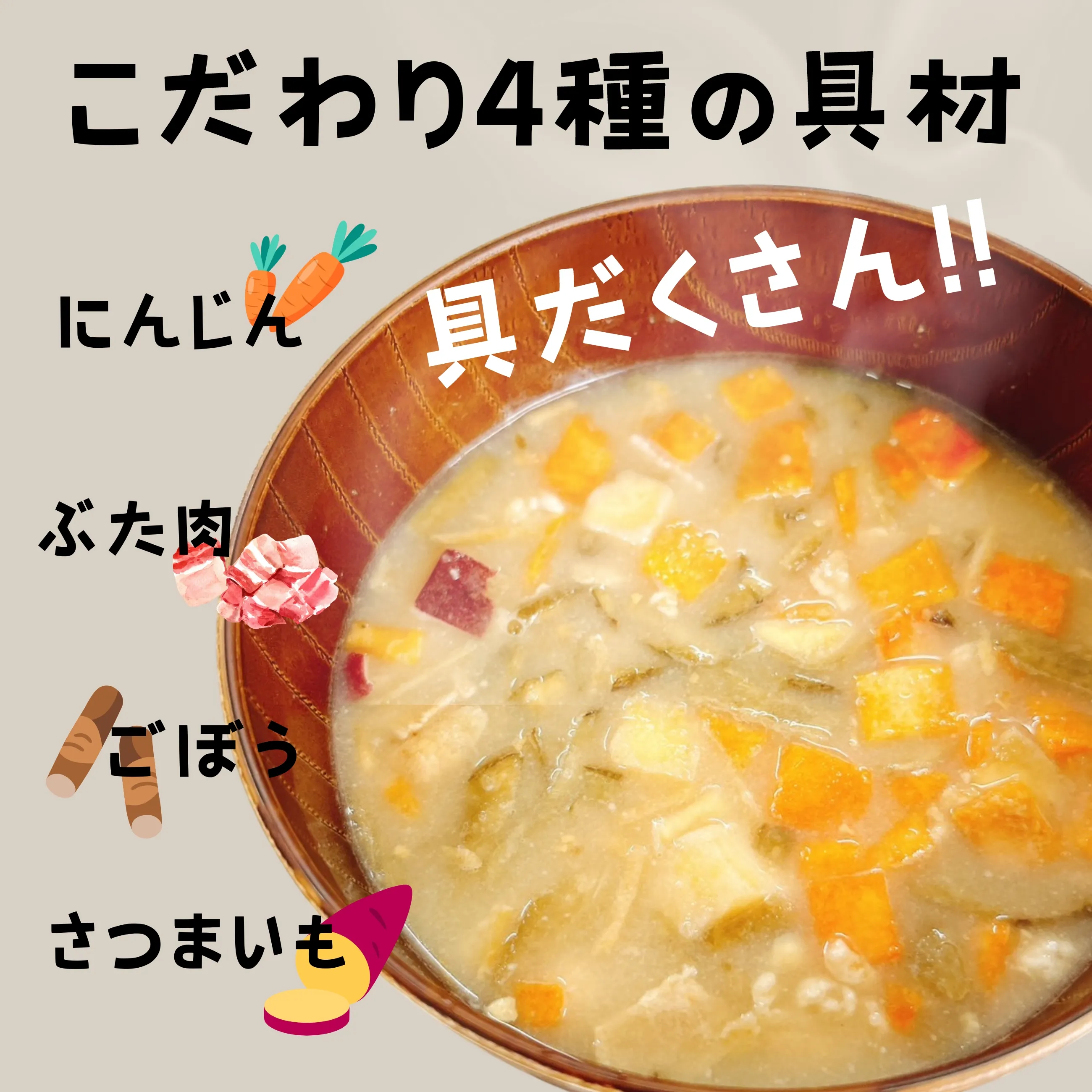 原材料名 豚肉(輸入)、酒粕、さつまいも、米みそ(大豆を含む)、ごぼう、人参、醸造調味料、生姜、ローストオニオンペースト、魚醤、しょう油(小麦を含む)、昆布エキス、ゴボウ風味パウダー、ポークオイル、砂糖、食塩 添加物 増粘多糖類、酸化防止剤(V.E) |