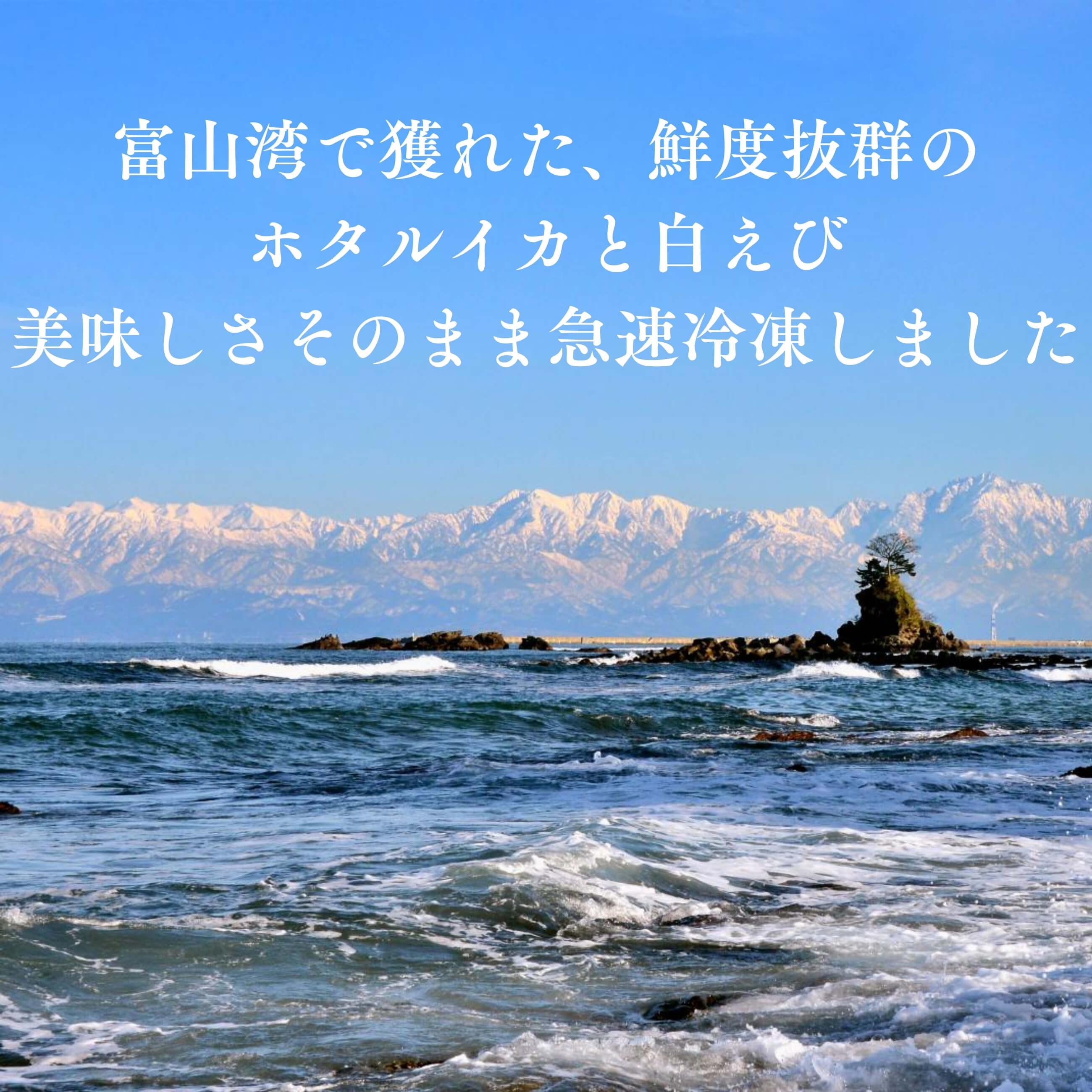 “天然のいけす”とも呼ばれるほど、魚種が豊富な富山湾。富山の名産『ほたるいか』『白えび』を浜から仕入れ、自社工場にて獲れたてを急速冷凍した商品です。鮮度抜群の素材を産地直送でお届けします。ご自宅で北陸・富山ならではの旬の味わいをお楽しみください。