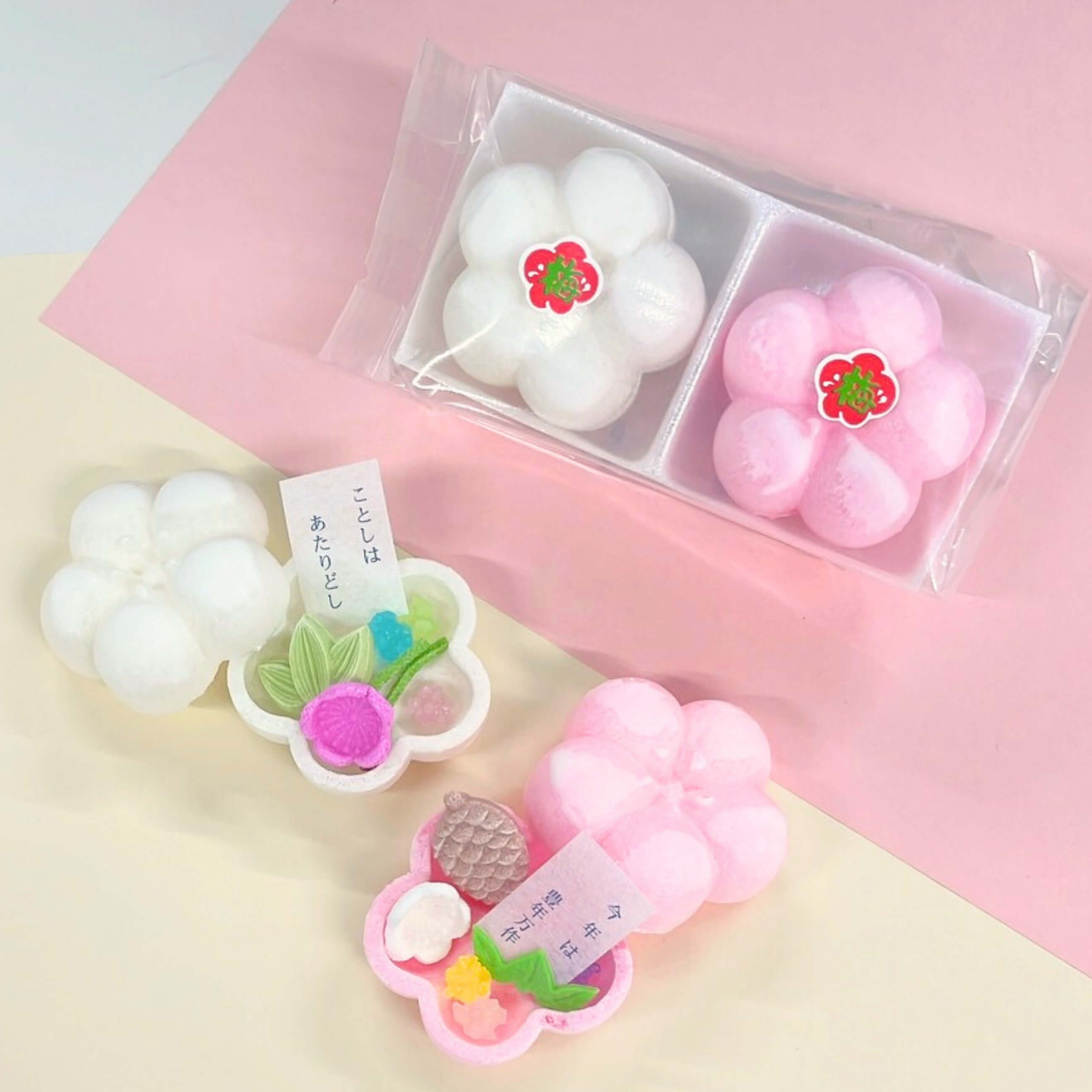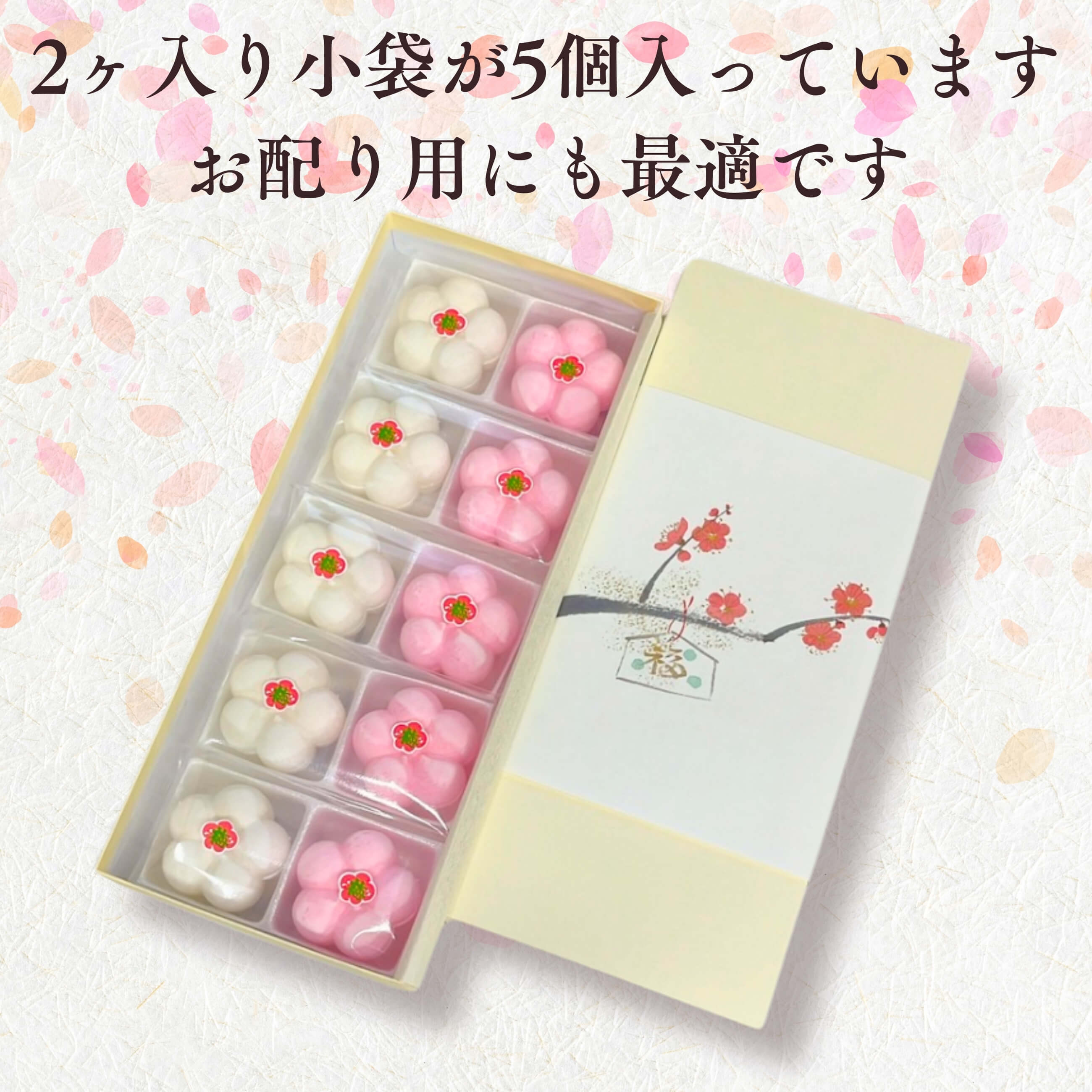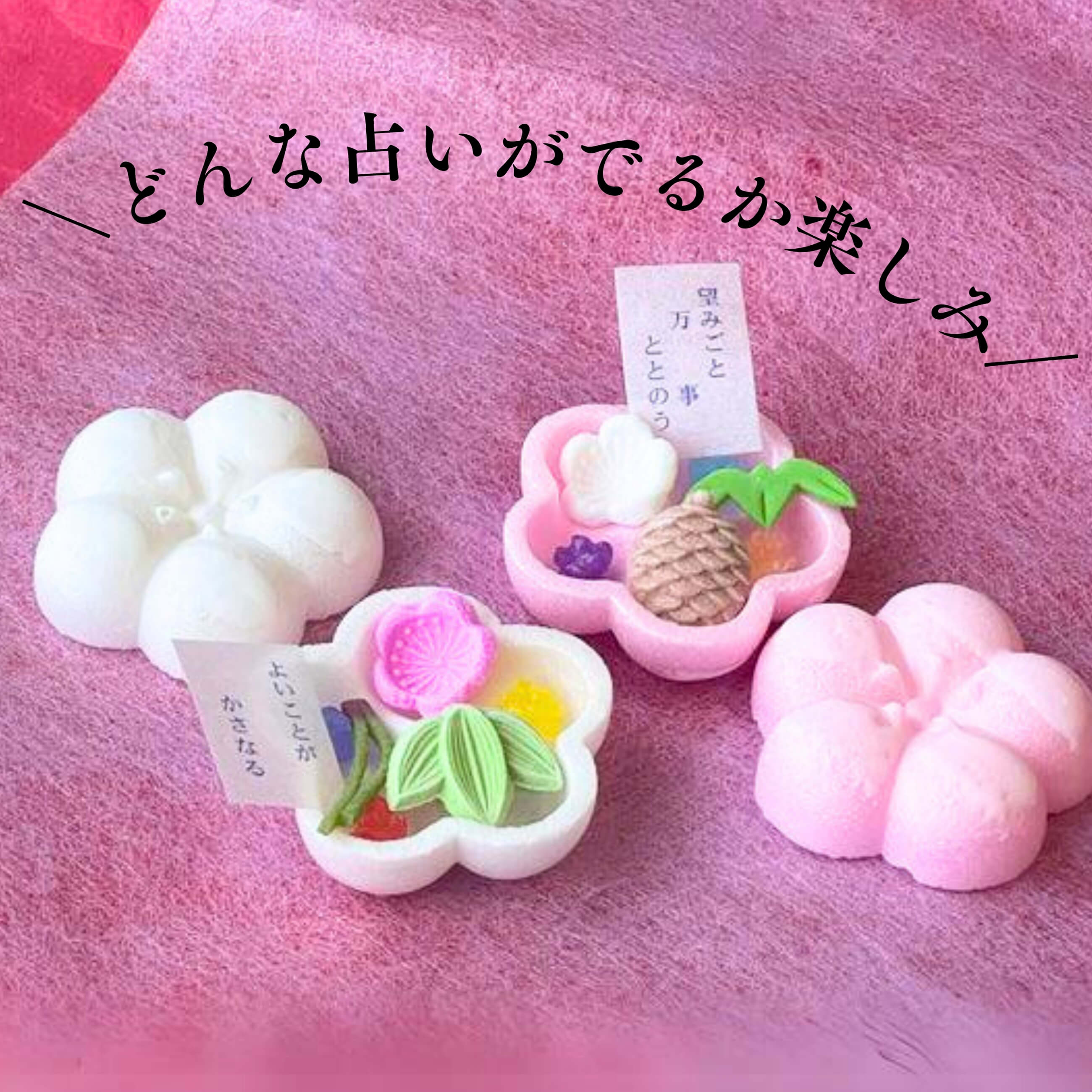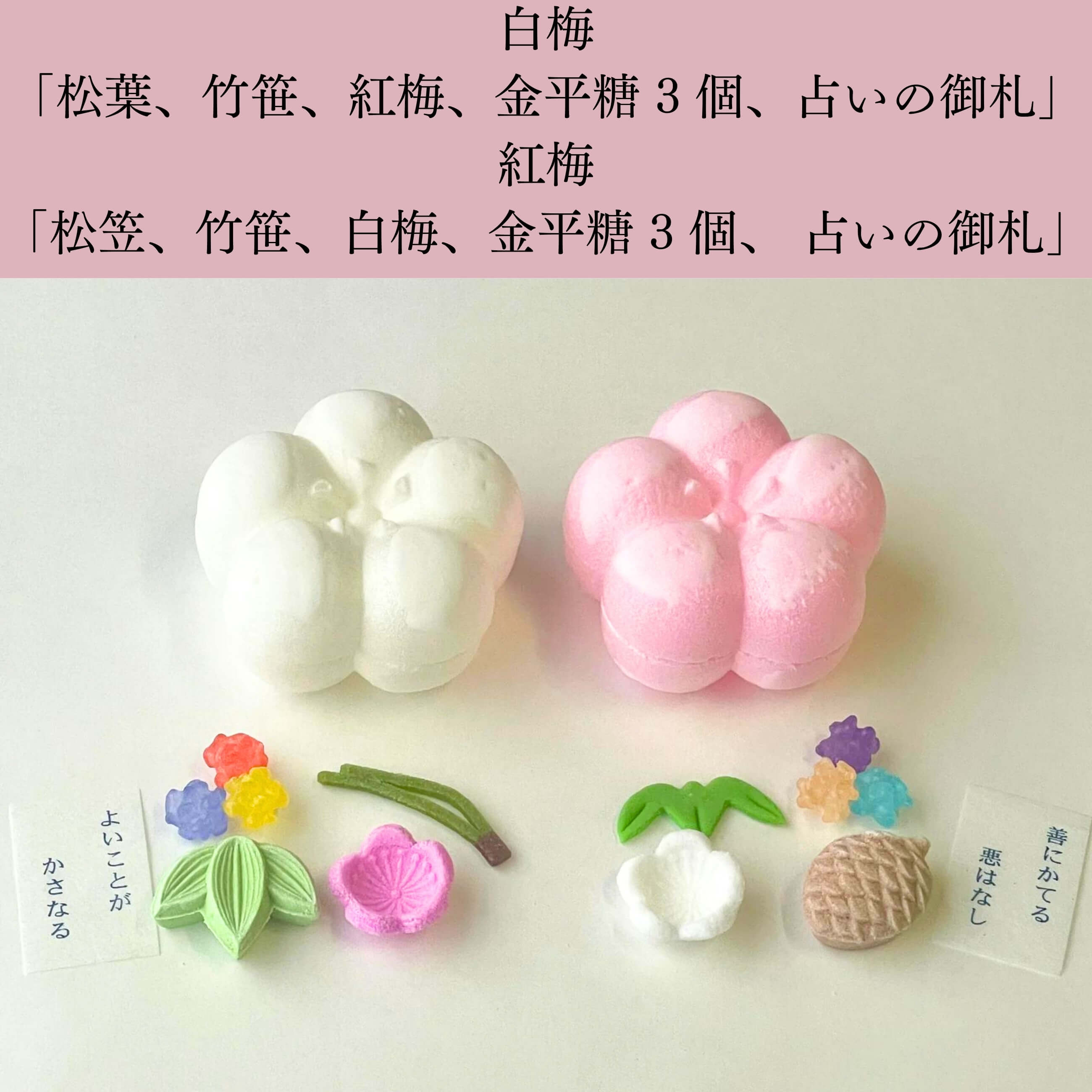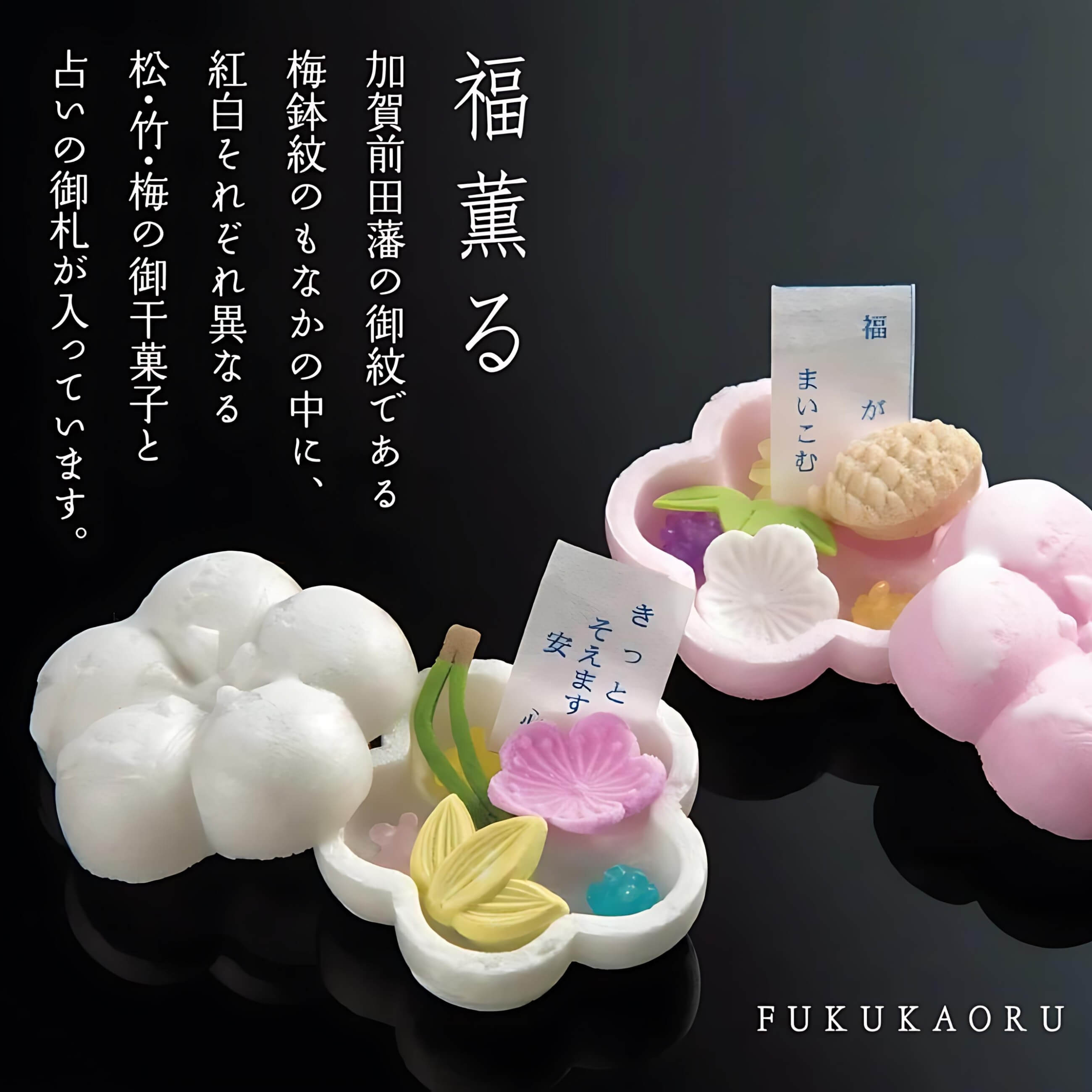 加賀 前田藩の御紋である梅鉢紋のもなかの中に、それぞれ異なる松竹梅の御干菓子と占いの御札が入っております。贈り物や慶事にも大変喜ばれます。