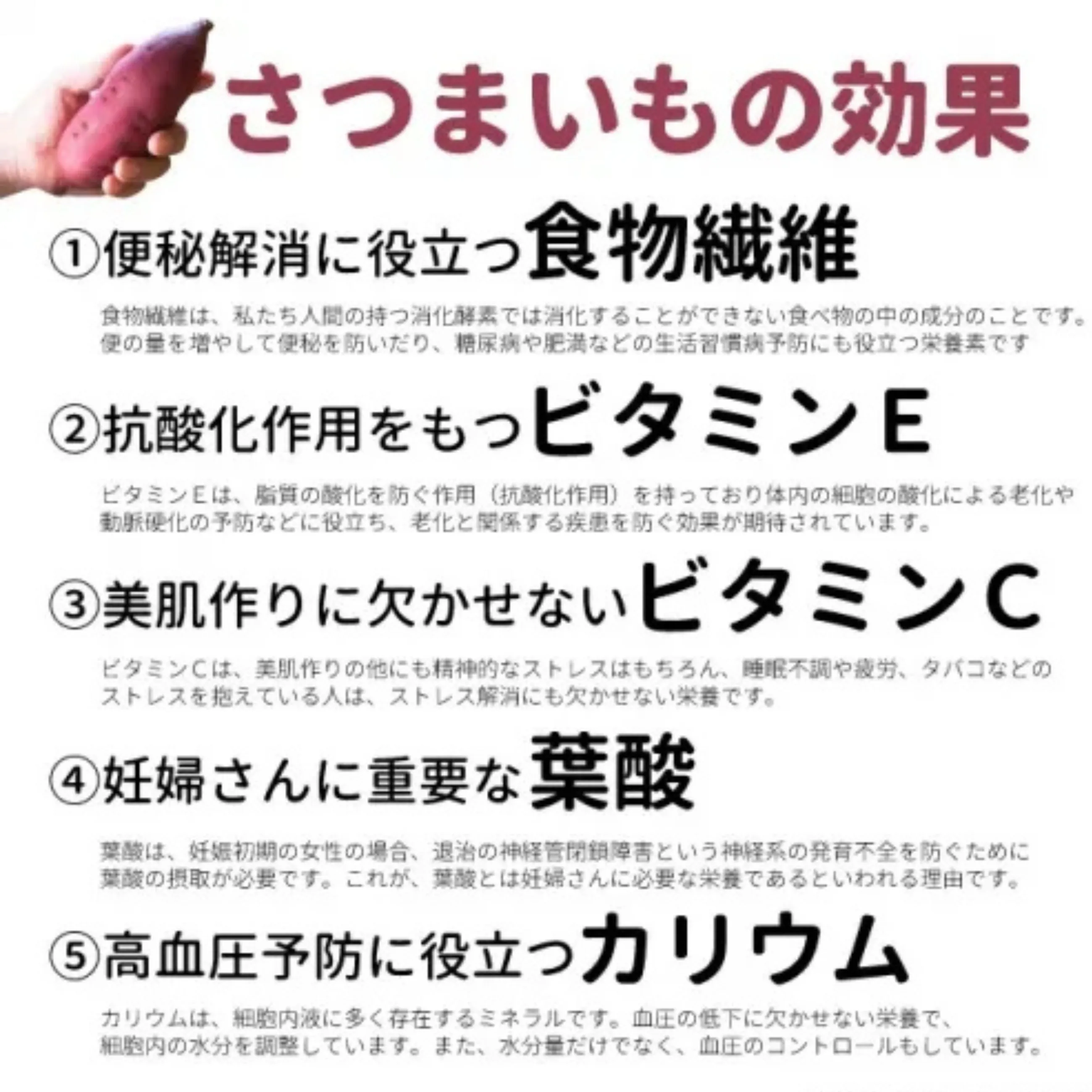 よくお客様から「大きいお芋と小さいお芋、どっちがおいしいの?」というご質問をいただきます。 五郎島金時は、1株あたりの収量800gが美味しいベストとされているので、生産者は1株800gを守っています。 1つの苗からできる五郎島金時は、1本の時も4,5本できる時もありますが、どちらも1株800g。 ということは、大きいお芋 1本(800g)も、小さいお芋5本(800g)も同じ美味しさ、ということになりますね! 弊社ではS/M/Lサイズとご用意しておりますので、食べる用途に応じてお選びいただけます。