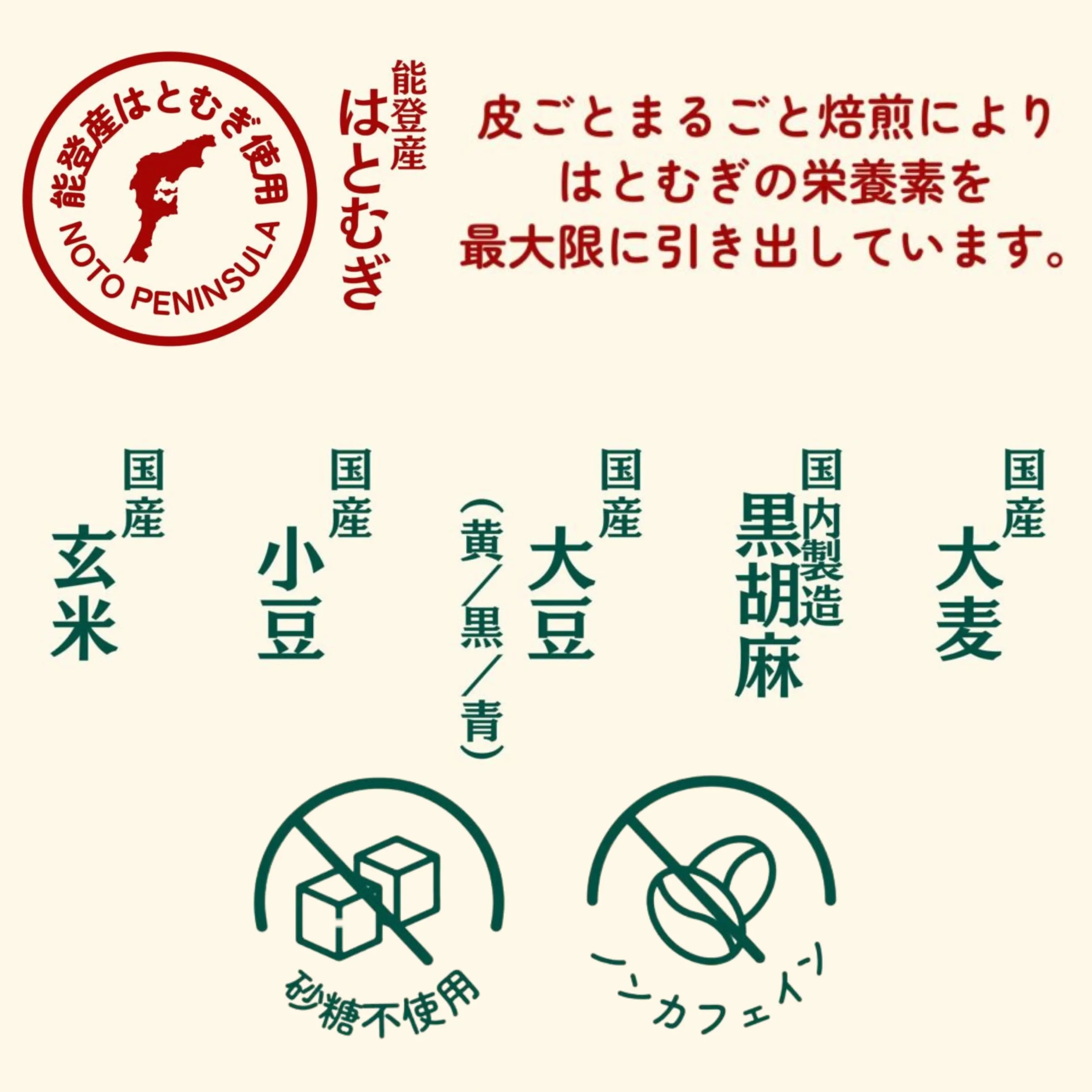 原材料は、大豆、玄米、大麦、はとむぎ、小豆、黒胡麻のみで、その大部分を品質の良い国産素材にこだわり、砂糖や添加物は一切使用していません。