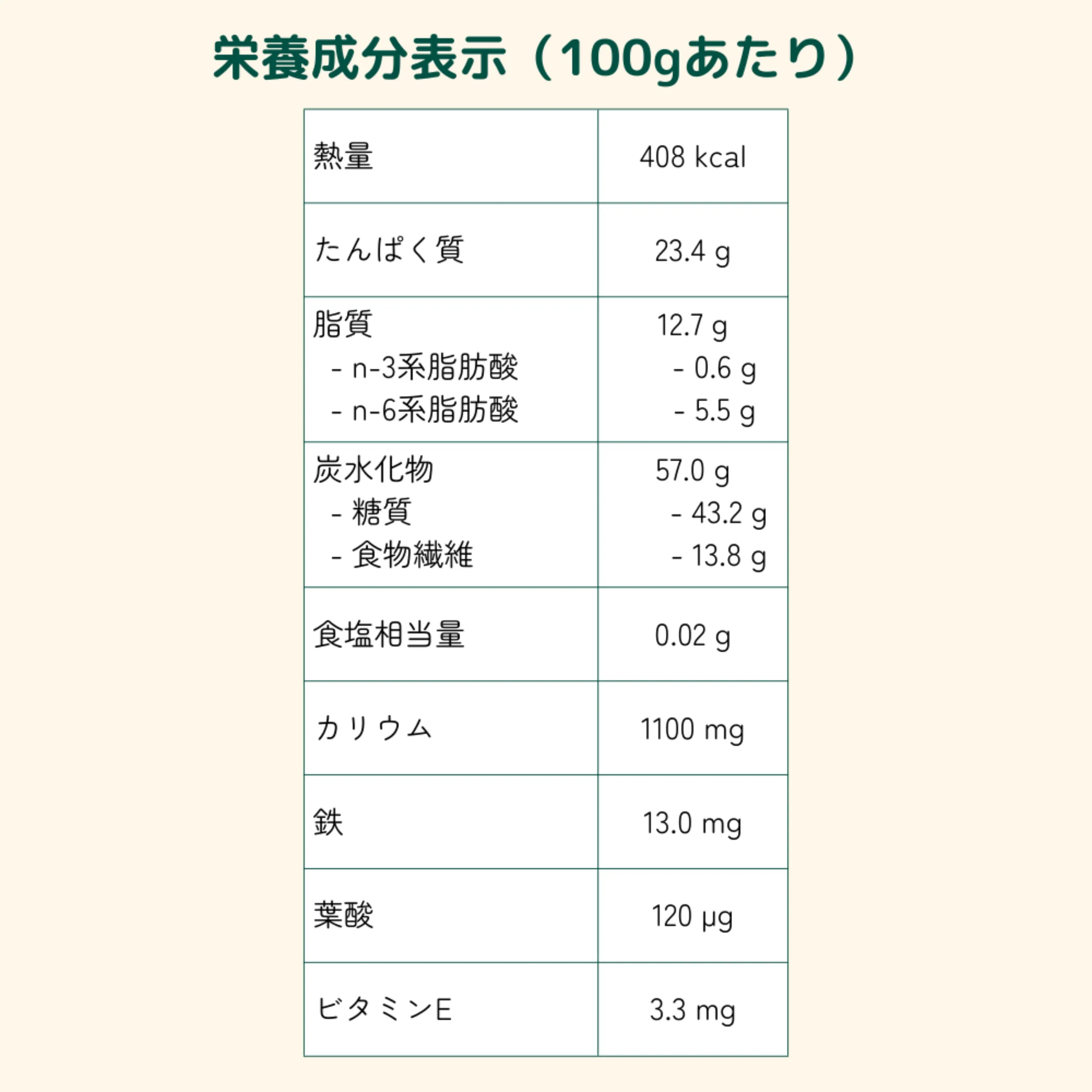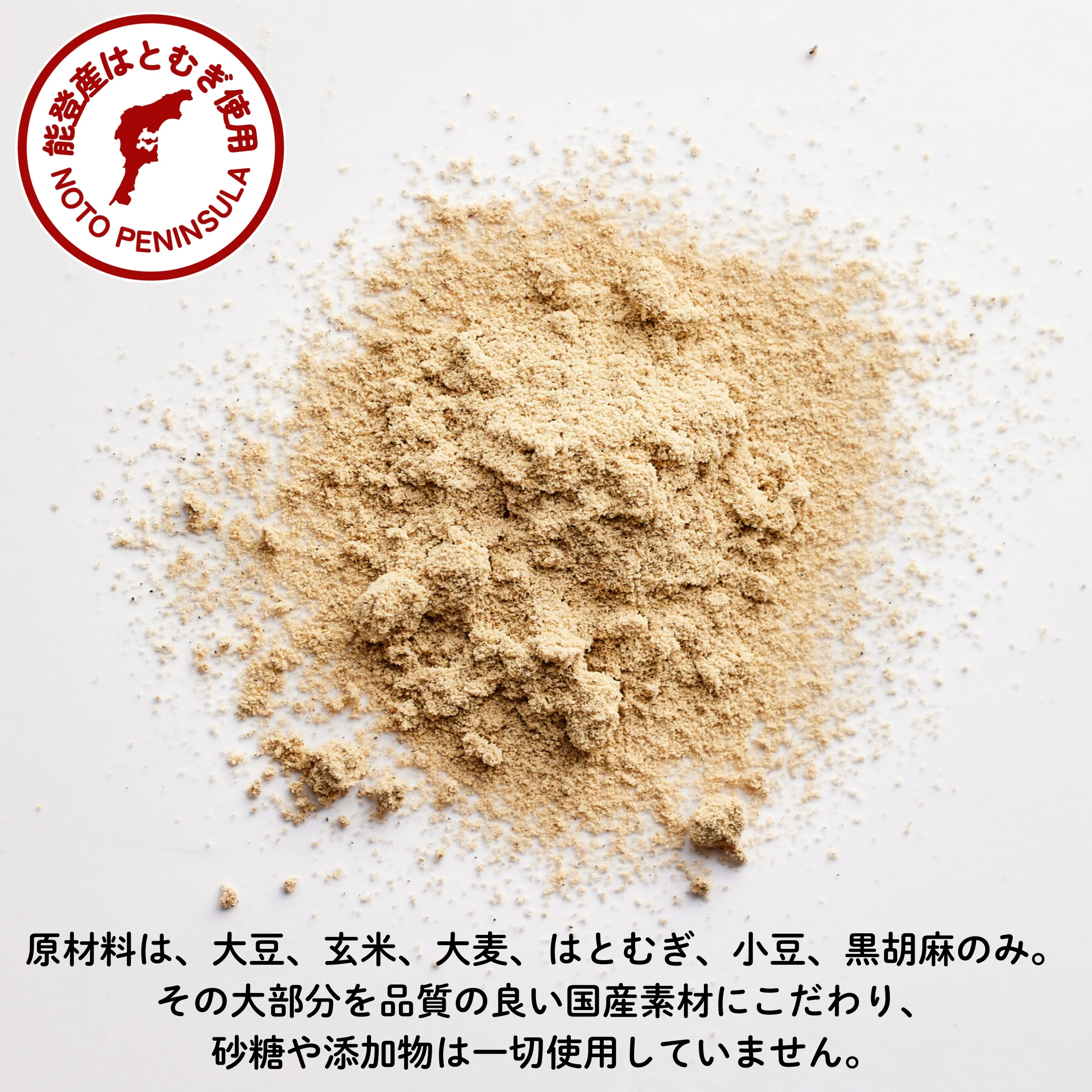 原材料は、大豆、玄米、大麦、はとむぎ、小豆、黒胡麻のみで、その大部分を品質の良い国産素材にこだわり、砂糖や添加物は一切使用していません。