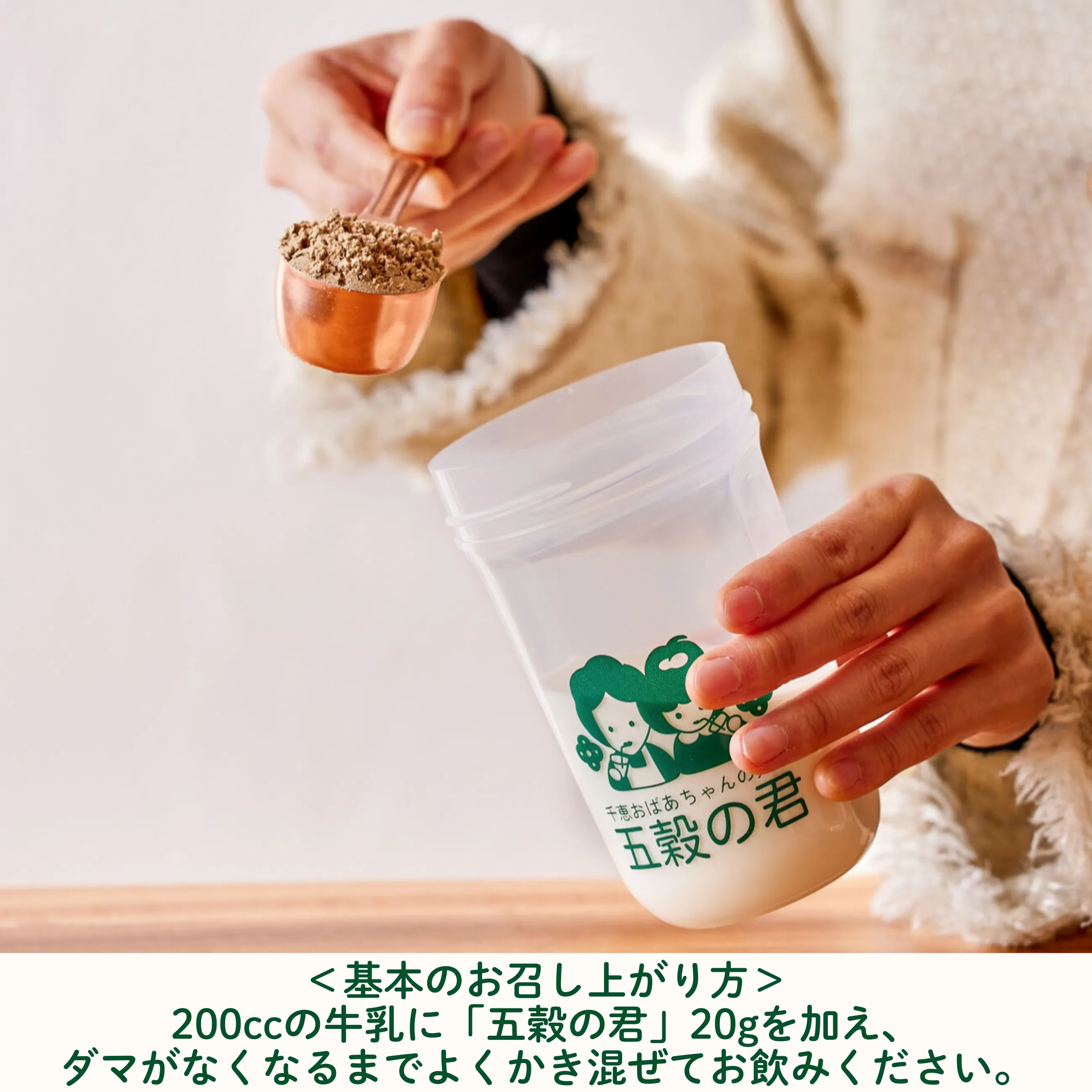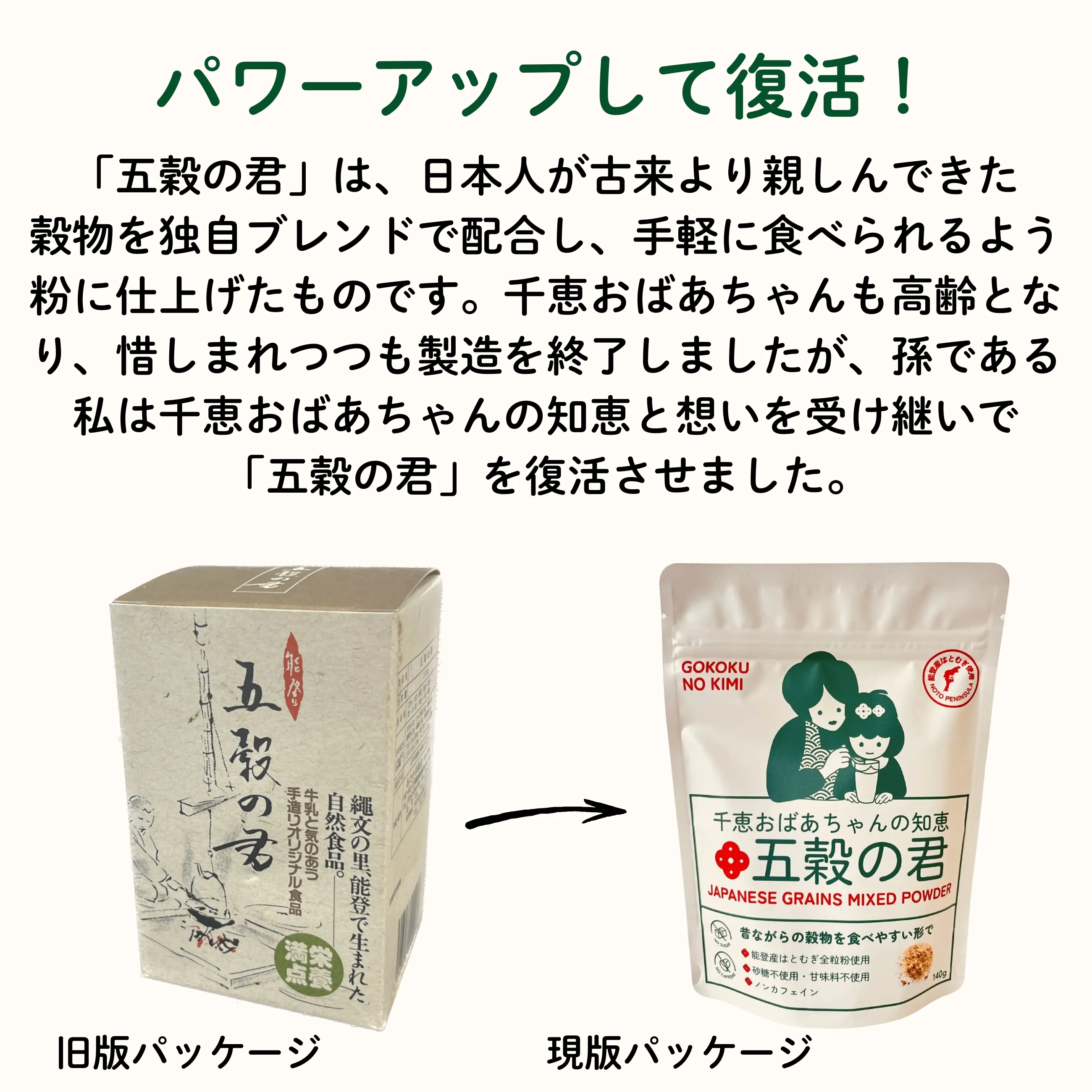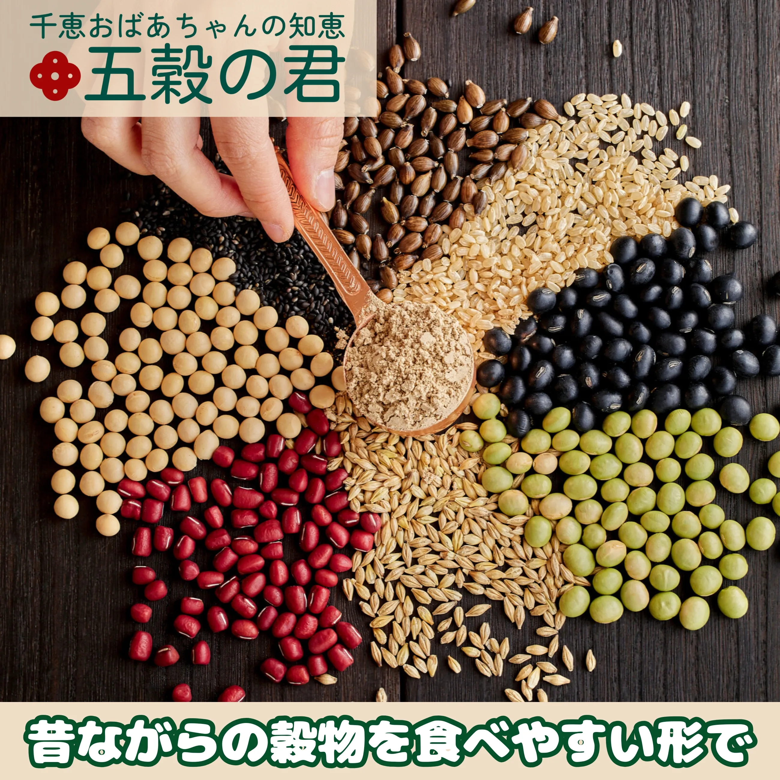 当時40代だった千恵おばあちゃんは、自身の体調不良に悩み、健康を取り戻したい一心で試行錯誤を重ねた結果、「五穀の君」の開発に至りました。